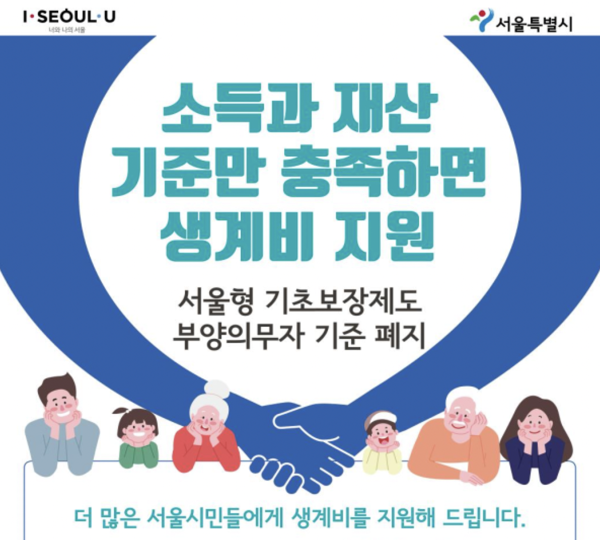 서울시에서는 지난달 4월 28일 부양의무제를 전면 폐지한다고 발표했습니다. 5월부터 시행되는 부양의무제 폐지로 2,300명이 추가로 지원받게 된다고 합니다. 신청은 동주민센터에서 하고 소득, 재산 기준에서 충족되면 부양가족이 있더라고 지원받을 수 있습니다.