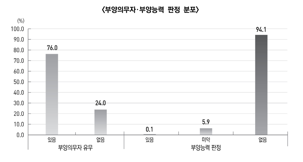 참고로 그래프에서처럼 2019년도 국민기초생활보장 수급자 현황의 부양의무자 현황 통계를 보면 부양의무자를 기준으로 부양능력 판정에서는 부양능력 없음이 94.1%이고, 부양능력 미약이 5.9%로 나타나는 것을 볼 수 있습니다.