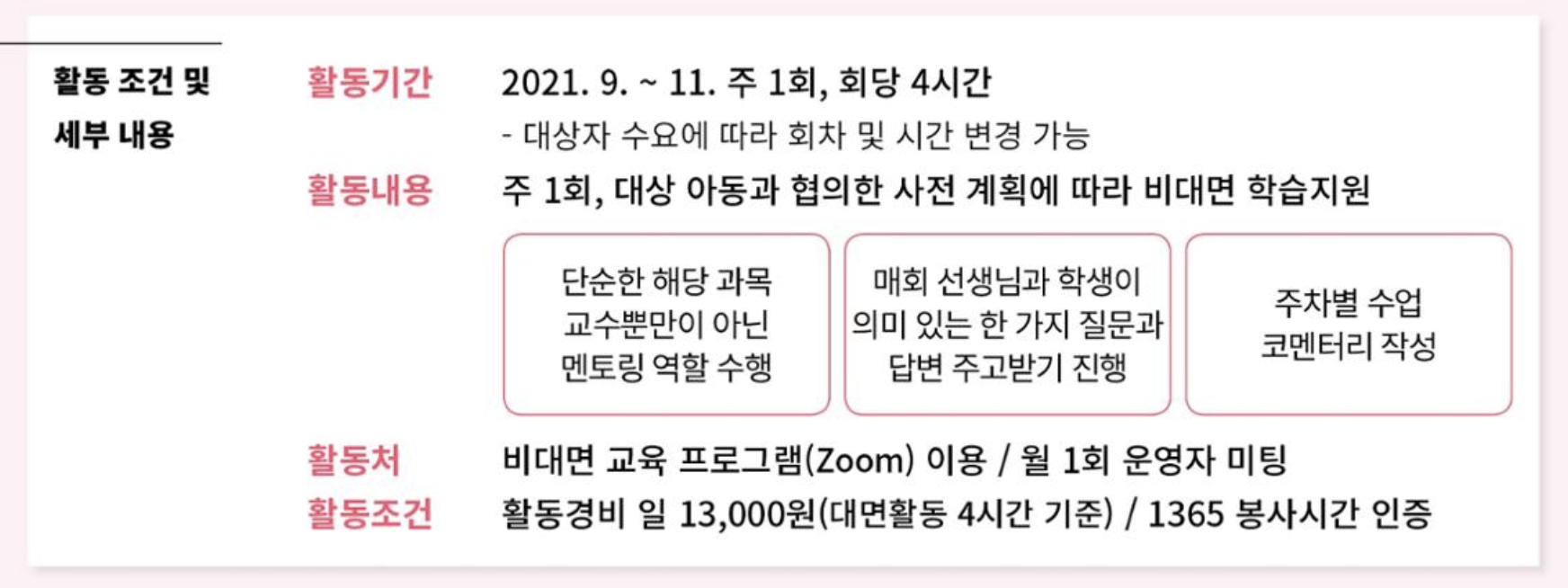 자세한 활동 조건이나 내용들은 서울시50플러스재단 포털에서 확인 가능하며 활동 내용은 주 1회 대상 아동과 미리 협의된 계획에 따라 비대면 학습 방식으로 지원됩니다.