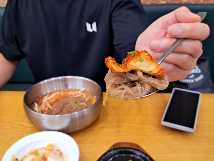 남편이 물냉면에 황태구이 한 점을 야무지게 올려서 한 입 주네요. 오 ~ 이 조화도 육쌈냉면 만큼 맛있어요. 한 번 드셔 보시죠.