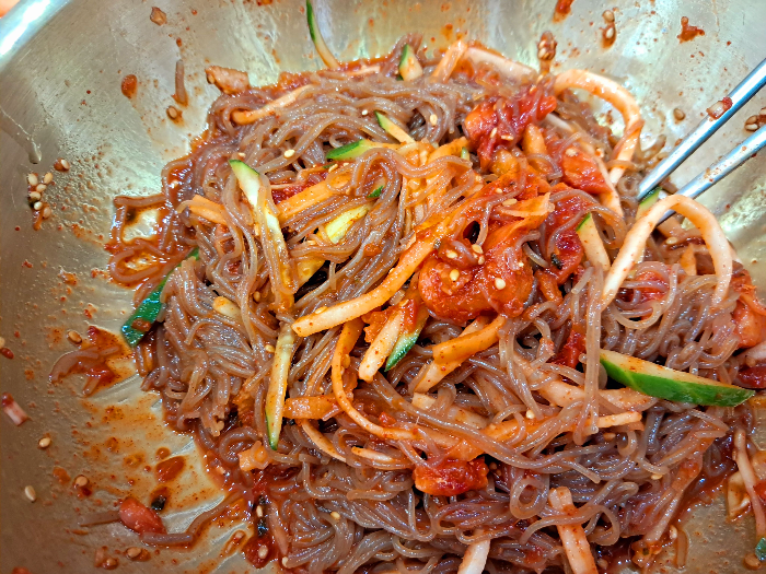 꼭꼭 달라붙어 있는 면을 살살 풀어서 쓱싹쓱싹 비벼서 한 입 왕~~~ 먹으니 운동하며 흘렸던 땀은 어느새 사라지고 추워지기 시작했어요.