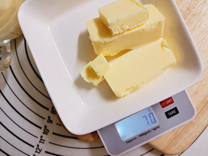 버터 70g을 사각형으로 잘라 체에 내린 가루류에 넣어 줄게요.
