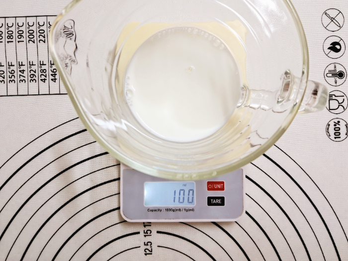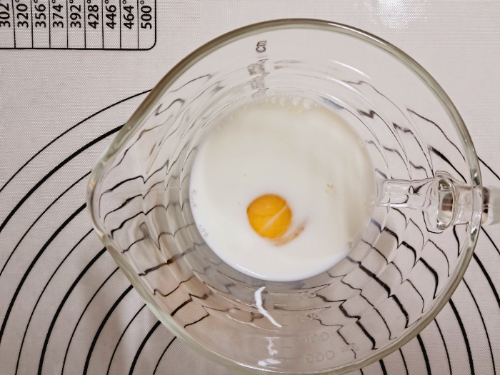 반죽에 들어갈 우유 100g에 달걀 한 개를 섞어줄게요.