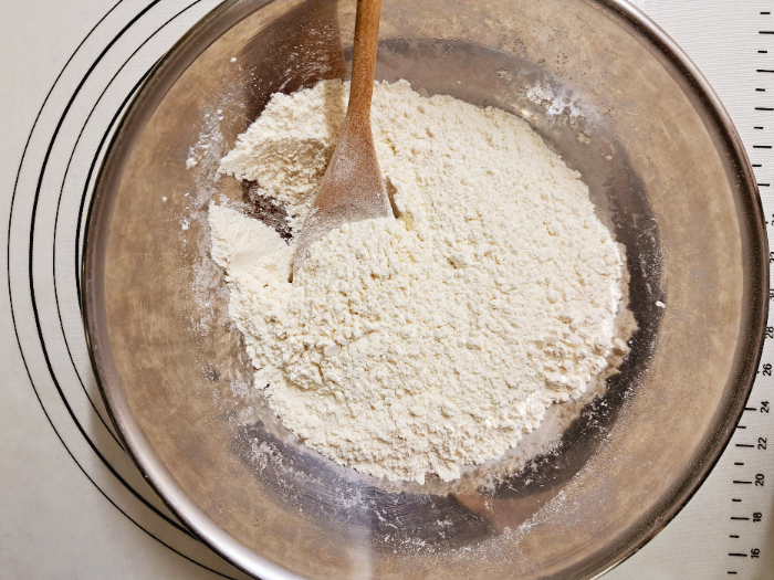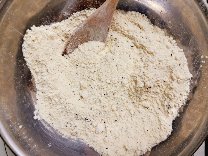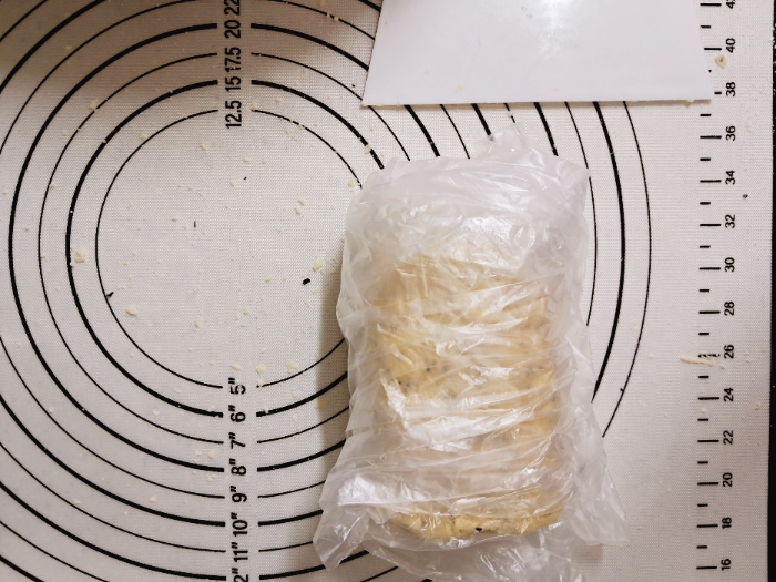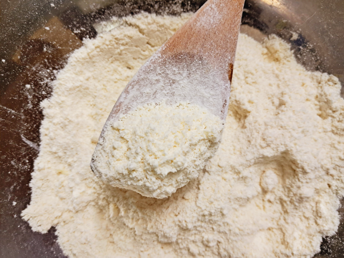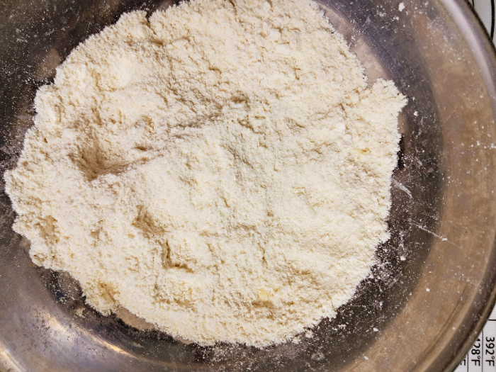 스크래퍼로 잘게 부수며 밀가루와 섞어주면 가장 좋은데 스크래퍼가 한 개밖에 없어 손으로 재빨리 섞어 주었어요.
