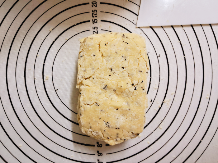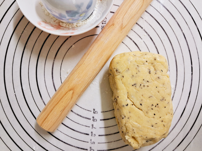 반죽패드 위에 밀가루를 펼쳐주고 냉동실에서 쉬었다 나온 얼그레이 스콘 반죽을 밀대로 밀어줍니다. (2 ~ 2.5cm)