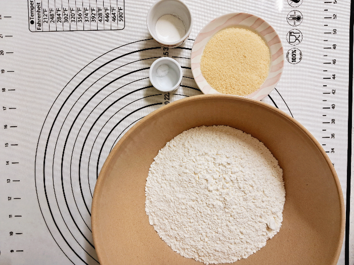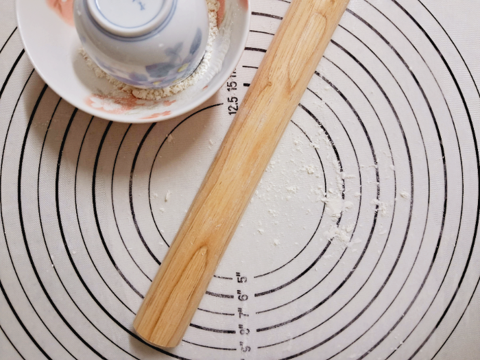 반죽 위에도 살살 덧밀가루를 뿌려주면 밀대에 안 묻어나 편합니다.