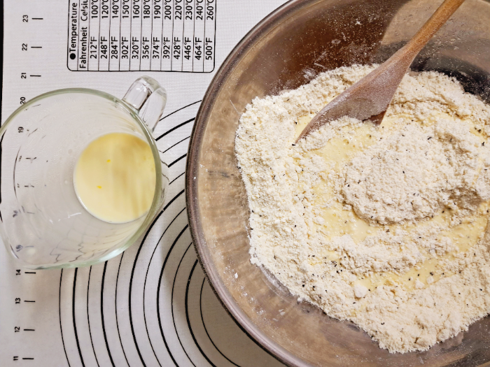 이때 주걱대신 포크를 이용해 섞어주면 비교적 편하게 밀가루가 대충 뭉쳐집니다.