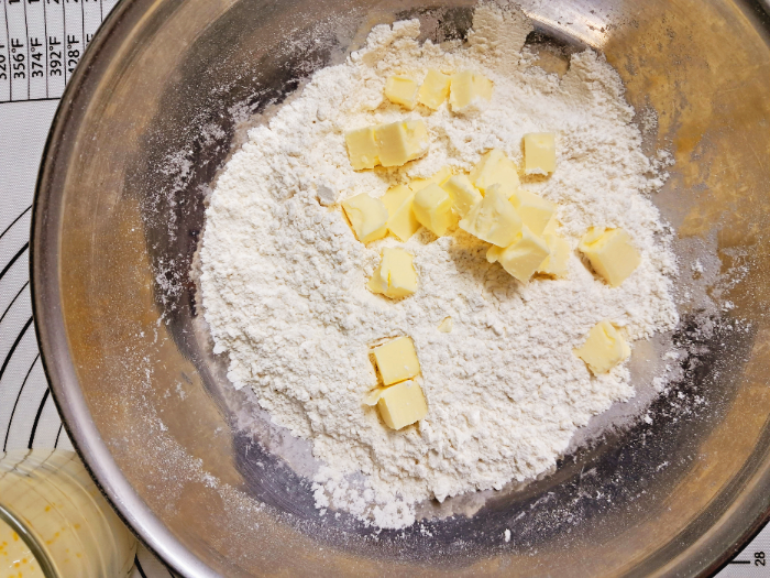 버터를 가루류에 섞는데 여기서 가장 중요한 포인트는 버터를 녹이면 안 된다는 사실!