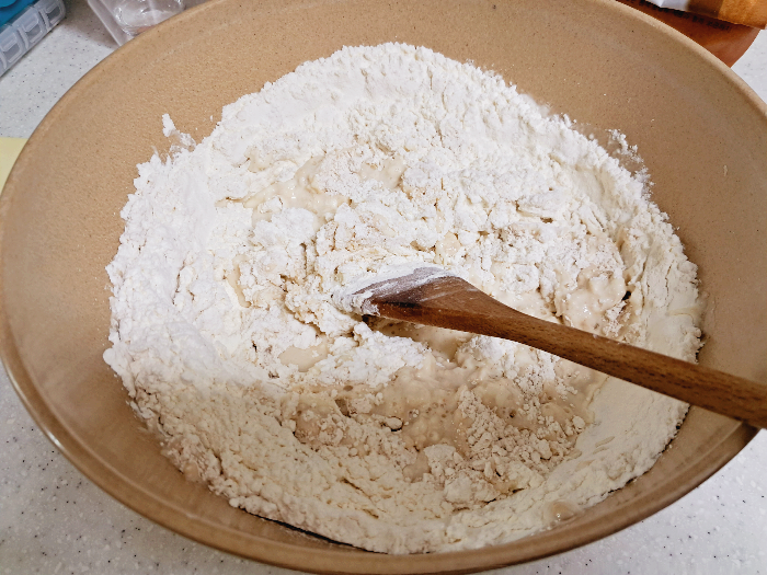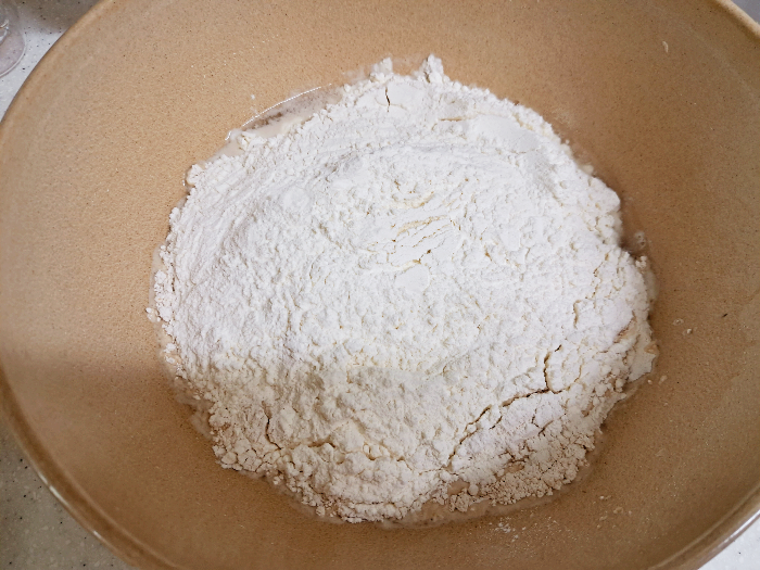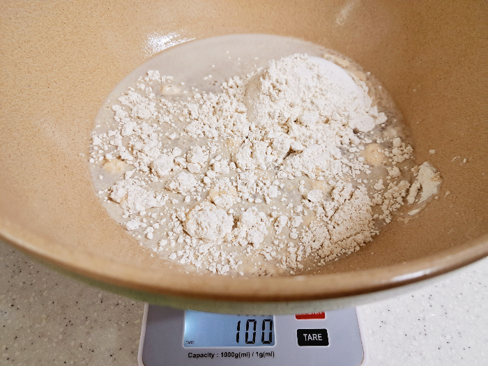 3. 통밀 100g + 강력분 300g 넣어 섞어줍니다.