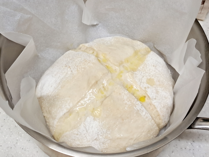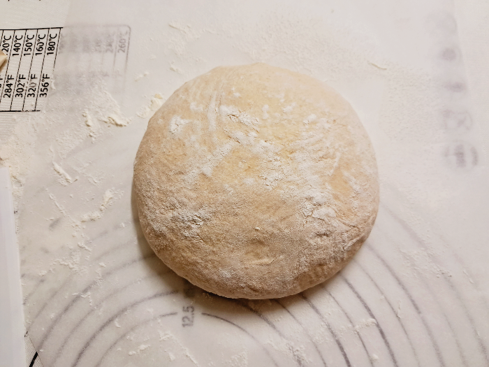 5. 둥글게 성형을 해줍니다. 이때! 성형하기 바로 직전에 오븐을 250도 30분으로 예열해 놓고 시작하면 시간이 얼추 맞아요. (각자 갖고 있는 오븐의 최고 온도 설정하면 됩니다. ) 저는 뚜껑 있는 스테인리스 냄비를 오븐에 넣어 함께 예열했어요.