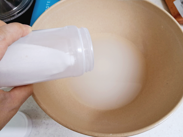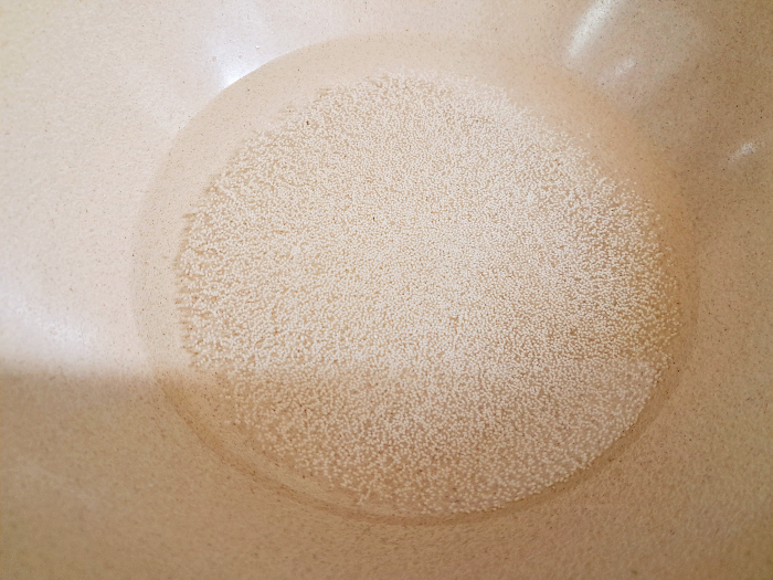1. 물을 따뜻하게(뜨거우면 안 됨!) 데워서 약 15g 정도의 물을 남겨두고 인스턴트 드라이 이스트 1g을 먼저 섞어줍니다.