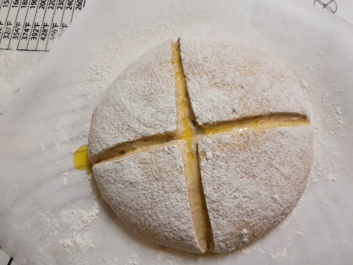 7. 오븐 예열이 끝나갈 때쯤 깜빠뉴 반죽에 덧가루를 뿌리고 쿠프를 내어줍니다. 쿠프를 내준 곳에 오일을 조금 뿌려두면 쿠프도 잘 열리고 바삭하고 그렇대요. ^^