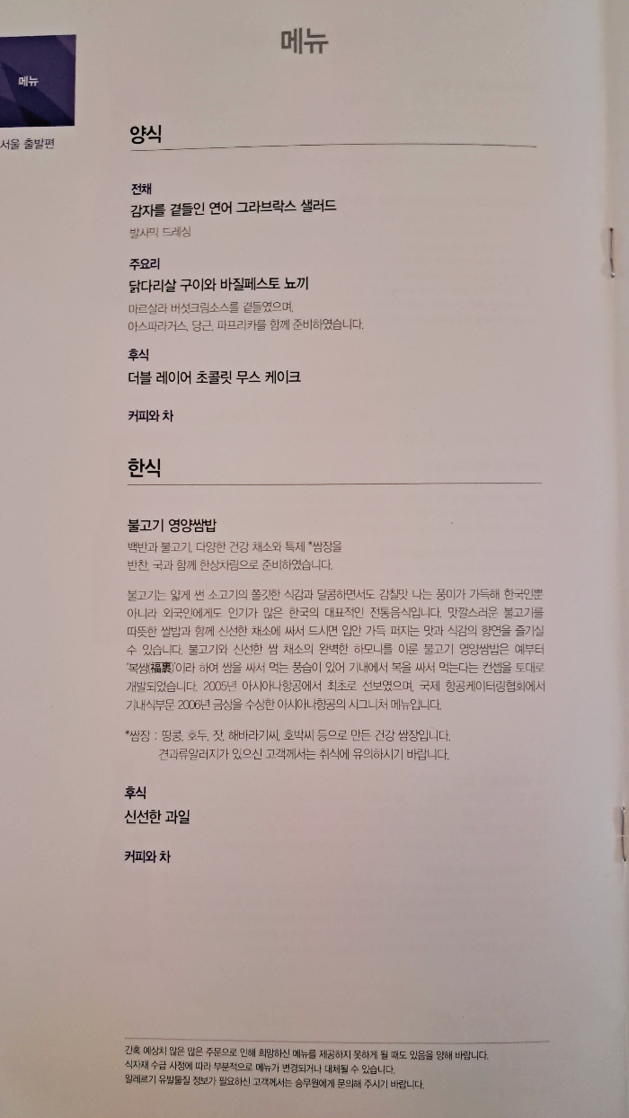 참고로 아시아나 기내식 메뉴판을 올려봄.