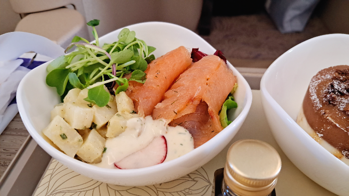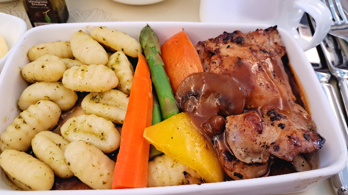 내가 주문한 아시아나 비지니스 기내식은 양식으로 메인요리는 닭다리살 구이와 바질페스토 뇨끼, 애피타이저는 감자를 곁들인 연어 그라브락스 샐러드, 후식으로는 더블 레이어 초콜릿 무스 케이크... 블라블라 ^^