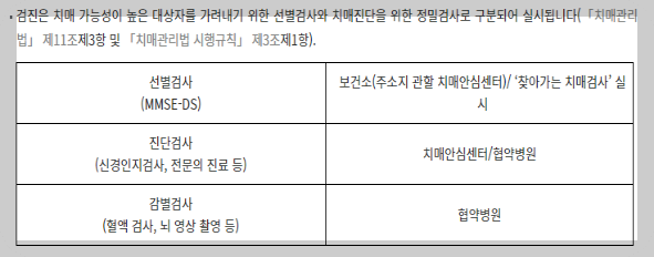 요즘에는 초로기치매도 증가하고 있고 많은 분들이 치매로 고통받고 있습니다. 아래 표는 치매 가능성이 높은 대상자를 위해 진단할 수 있는 곳인데요.