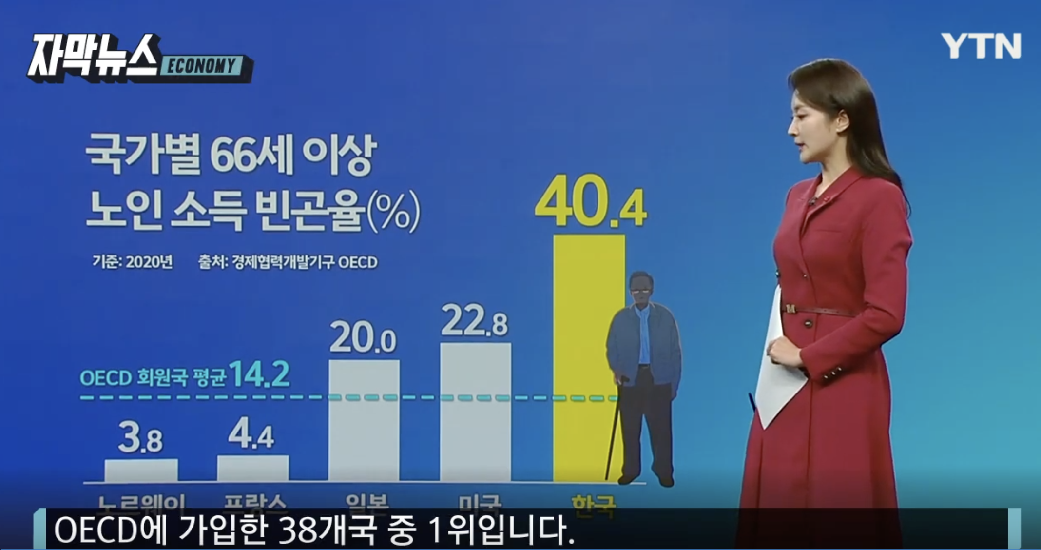 2023년 12월 21일 YTN 뉴스에 따르면, 한국 노인 빈곤율이 경제협력개발기구(OECD) 회원국 중 가장 높게 나타났다. 최근 OECD에서 발표한 2020년 기준 통계에 따르면, 66세 이상 노인 인구의 소득 빈곤율은 40.4%로, 38개국 중 1위를 차지하고 있다. 특히 노인 소득 빈곤율이 40%를 초과하는 나라는 한국뿐이며, 전체 회원국의 노인 빈곤율 평균은 14.2%인데 비해 한국은 3배에 달한다. 일본은 20%로 두 배 이상 낮고, 미국도 22.8%로 우리의 절반 수준이다.