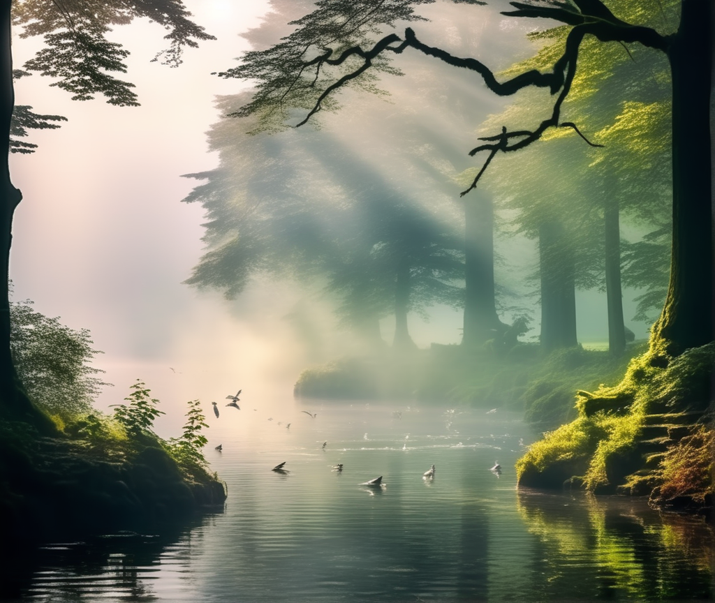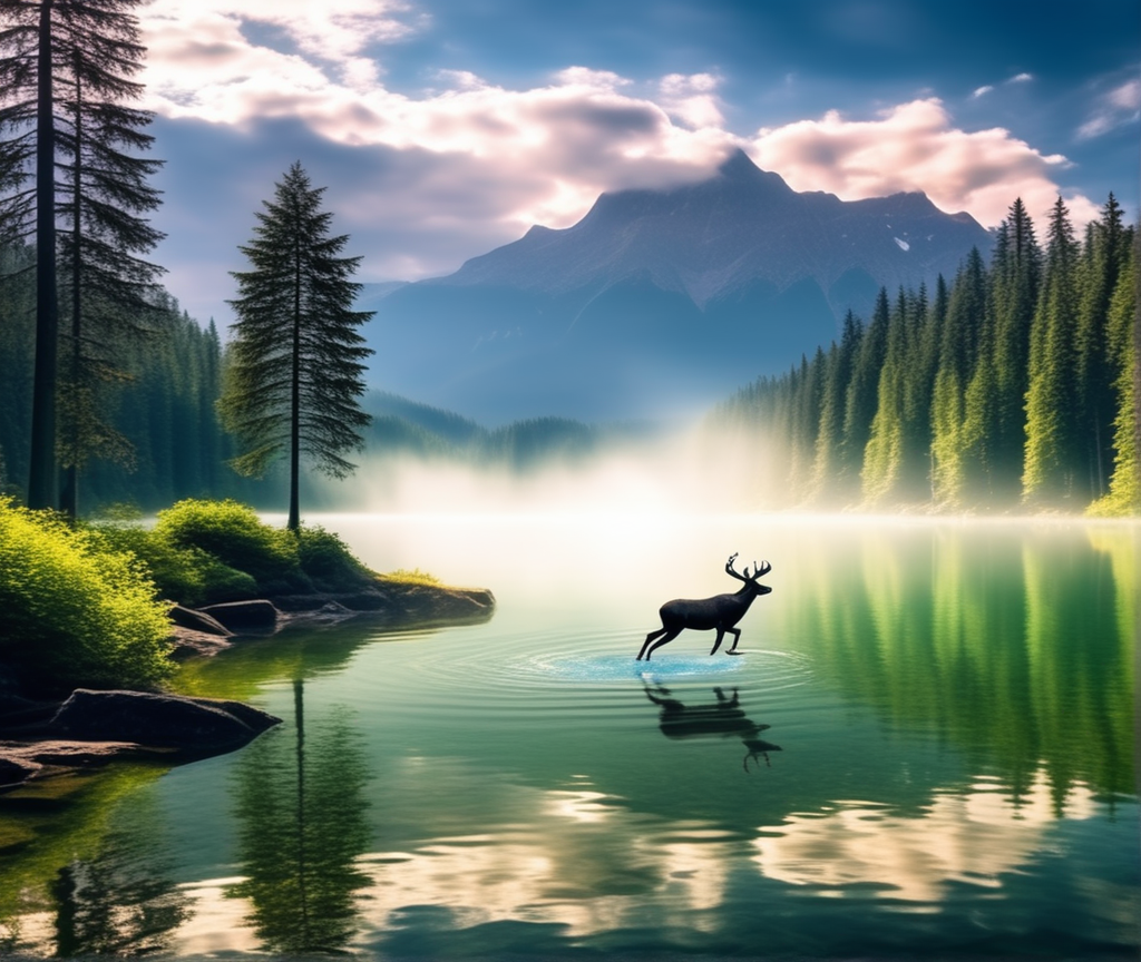 플레이그라운드 AI는 영어로 입력했을 때 의도했던 결과물에 근접한 결과물이 나왔답니다. 신비로운 물안개 호수, 신비로운 동물이 뛰어노는, 주변 숲이 무성한... 이런 내용으로 해봤어요.