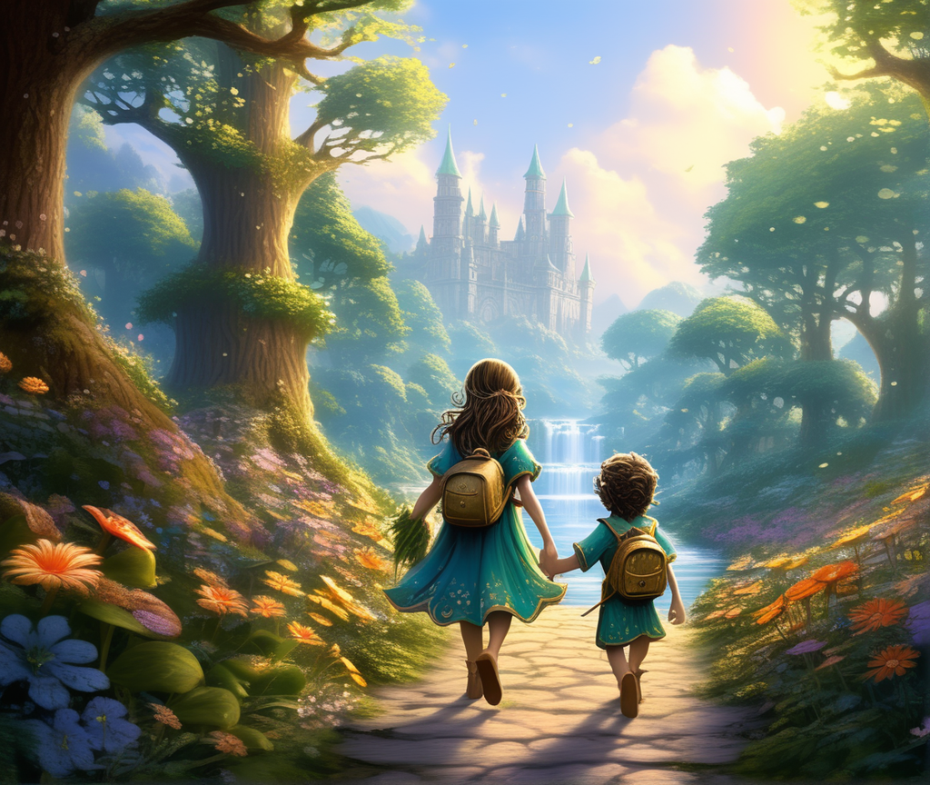 폭포가 흐르는 숲 속의 어린 아이 두 명이 손잡고 걷는 내용을 입력했을 때 나온 결과물인데 나름 만화 속 한 장면 같기도 하고 동화책 속 그림 같기도 해서 마음에 들었어요.