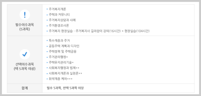 자격시험은 1교시와 2교시로 나뉘며, 주거복지 총론과 주거복지 실무와 적용에 대한 시험이 진행됩니다. 각 과목당 40점을 획득하여 평균 60점 이상이면 합격이며, 시험은 1시간 동안 진행됩니다. 필수 이수 과목은 주거복지 개론, 주택과 커뮤니티, 주거복지 상담과 사례, 주거 환경 조사, 주거복지 현장 실습으로 이루어져 있고, 선택 이수 과목은 다양한 주제의 5과목을 선택하면 됩니다.