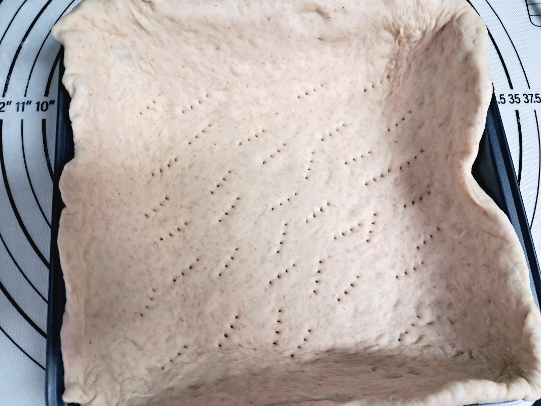 사각팬에 맞춰서 펼쳐주는 게 이번 시카고피자 만들기에서 가장 힘든 과정이었습니다. 생각처럼 잘 안되더라고요. 그리고 바닥을 포크로 찍어주시면 부풀어 오르는 것을 방지해 준다고 해요.