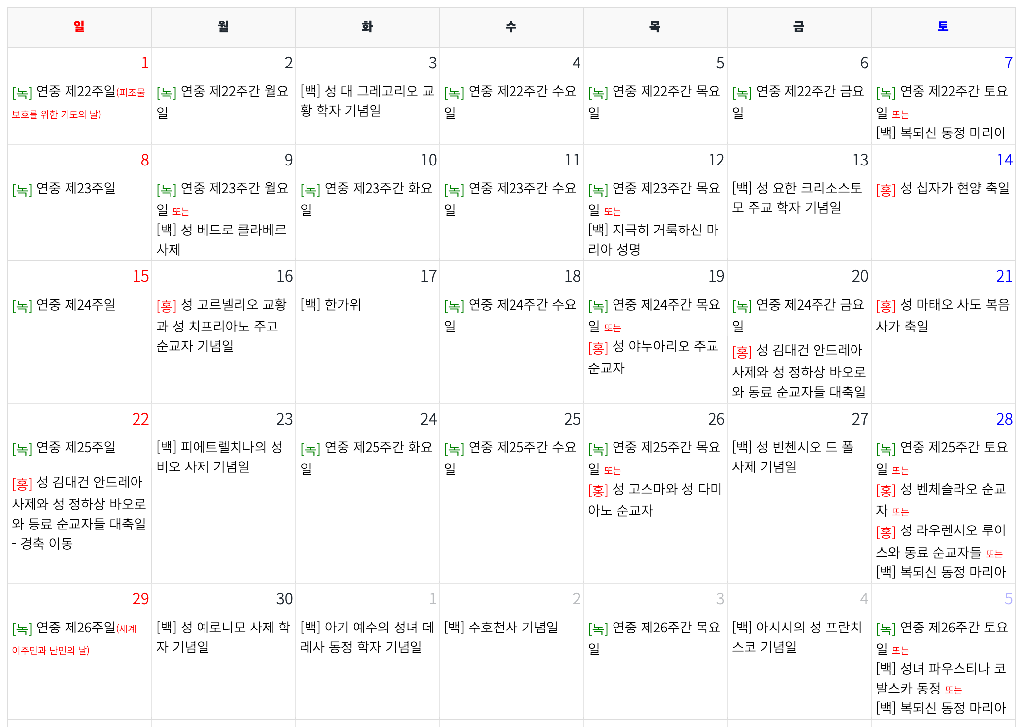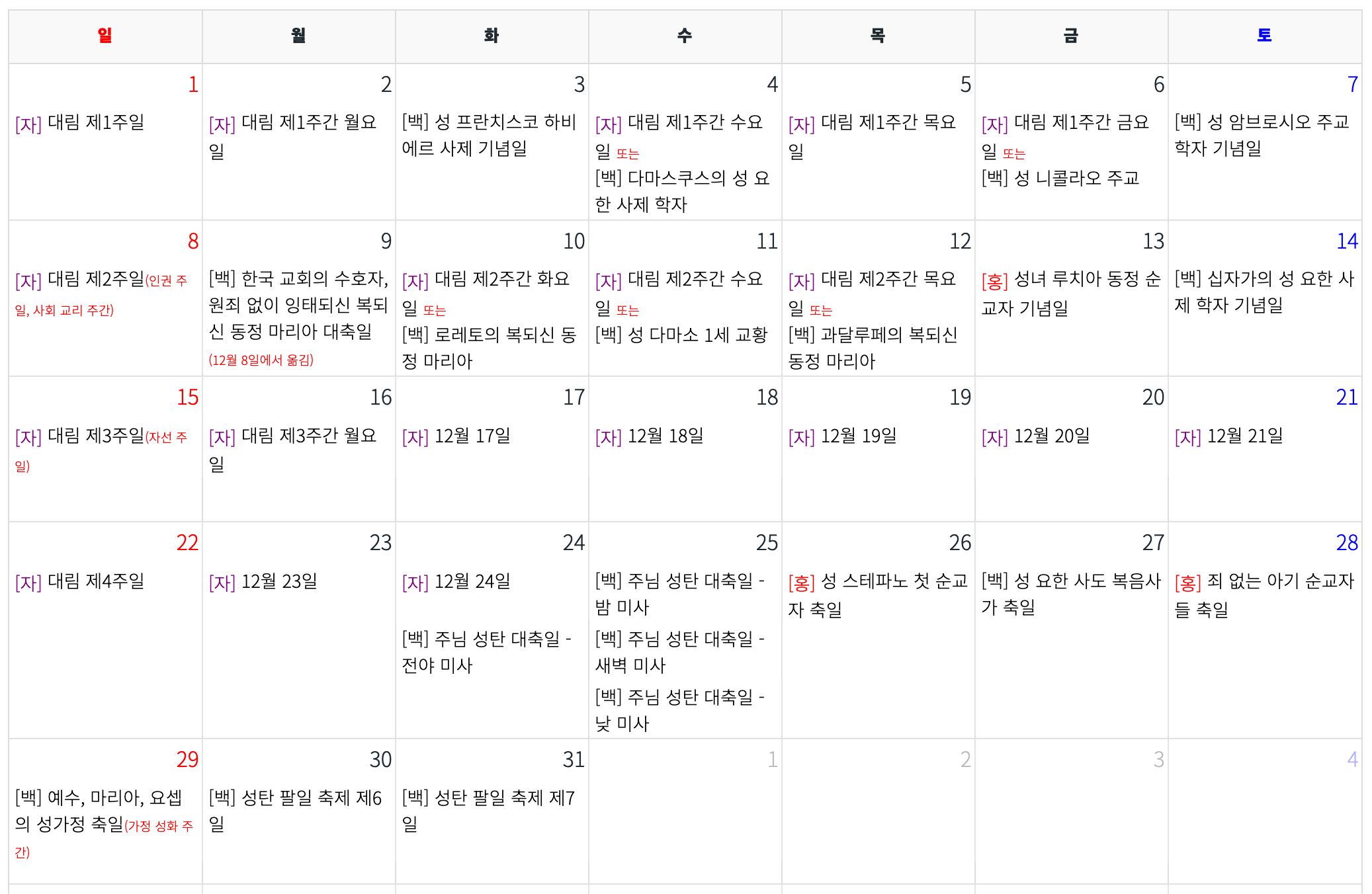 이전 전례력 포스팅에서도 적었지만 우선 자세한 내용은 '한국천주교주교회의·한국천주교중앙협의회'에서 찾아보실 수 있으니까요. 더 구체적인 내용을 보고 싶으신 분들은 해당 홈페이지를 이용해 보시길 바랄게요.