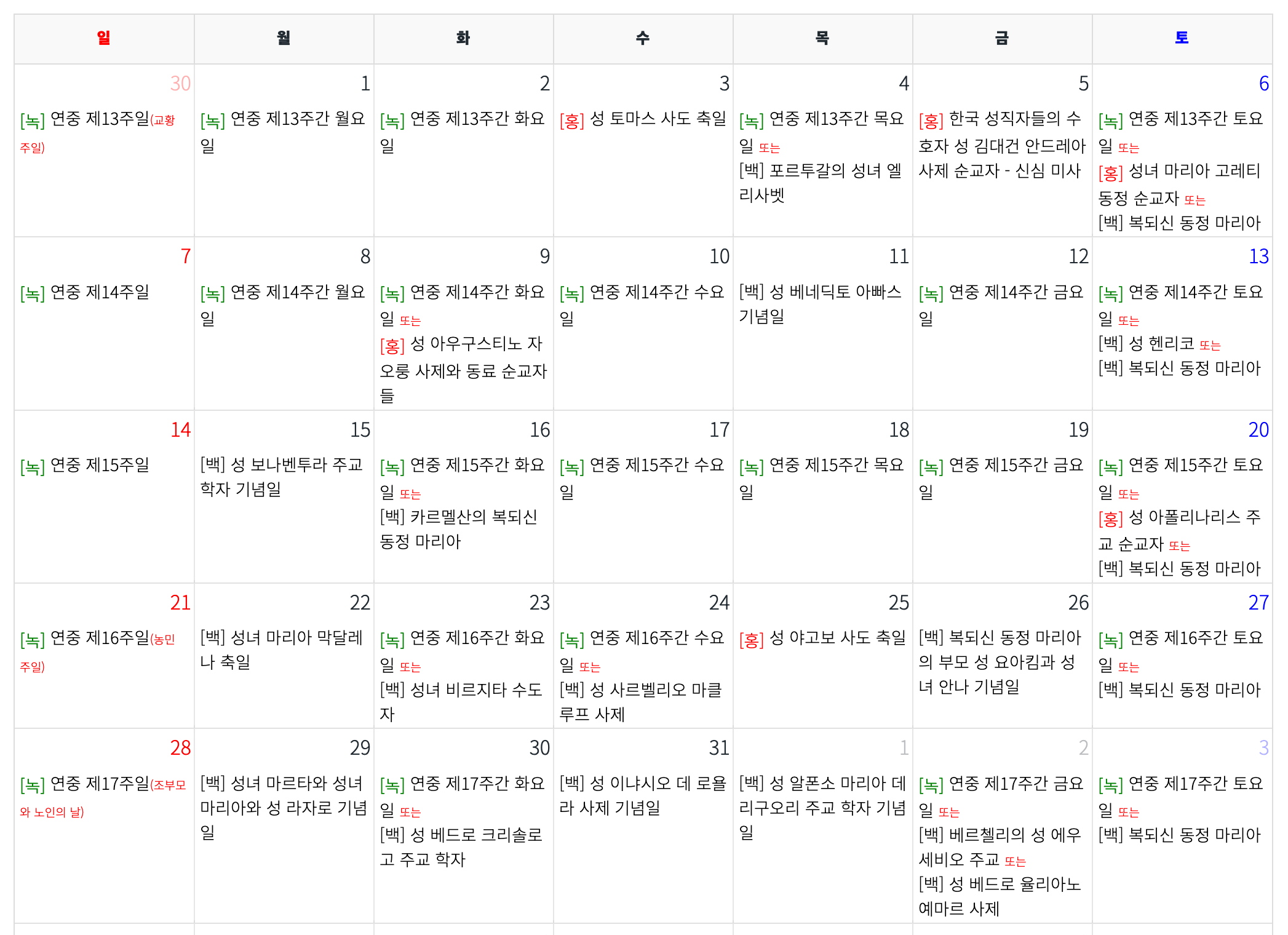 2024년 전례력 1월에서 6월까지 포스팅을 올렸었고요. 이어서 하반기 7월에서 12월까지 가톨릭 전례력을 참고하실 수 있길 바라며 올려봅니다.