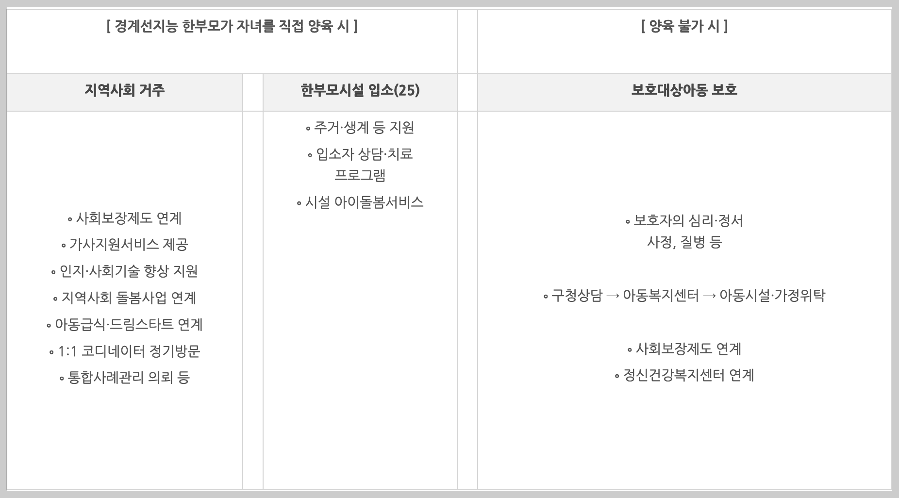 사례관리위원회의 의견을 바탕으로 맞춤형 서비스를 제공합니다. 경계선 지능 한부모가 지역사회에서 직접 양육하기를 희망하는 경우 ‘한부모가족지원센터’의 지원을 받을 수 있습니다. 일시적으로 주거와 생계를 필요로 하는 경우에는 ‘한부모가족복지시설’로 연계하며, 직접 양육이 어려운 경우 ‘가정위탁’ 및 ‘아동복지시설’로 연계해 자녀 양육을 지원합니다. 지역사회 거주 시 한부모가족지원센터에서 양성한 전문코디네이터가 1:1 가정방문을 통해 생활지원, 정보제공, 모니터링 역할을 수행합니다.