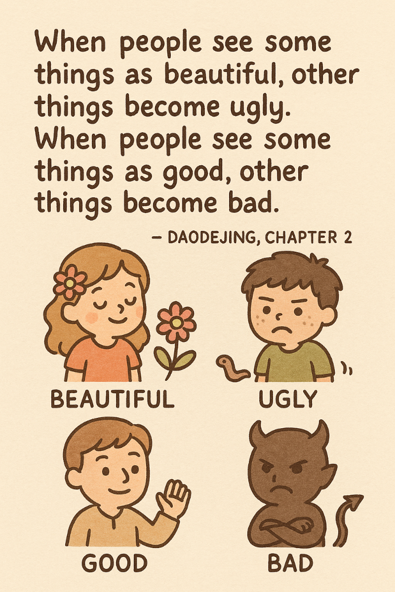 사람들이 어떤 것을 '아름답다''아름답다'라고 느끼는 순간, 자연스럽게 '아름답지 않음', 즉 '추함'도 함께 생겨나요. 누군가를 '선하다''선하다'라고 하면, 그와 동시에 '악함'이라는 개념도 드러나게 되죠.