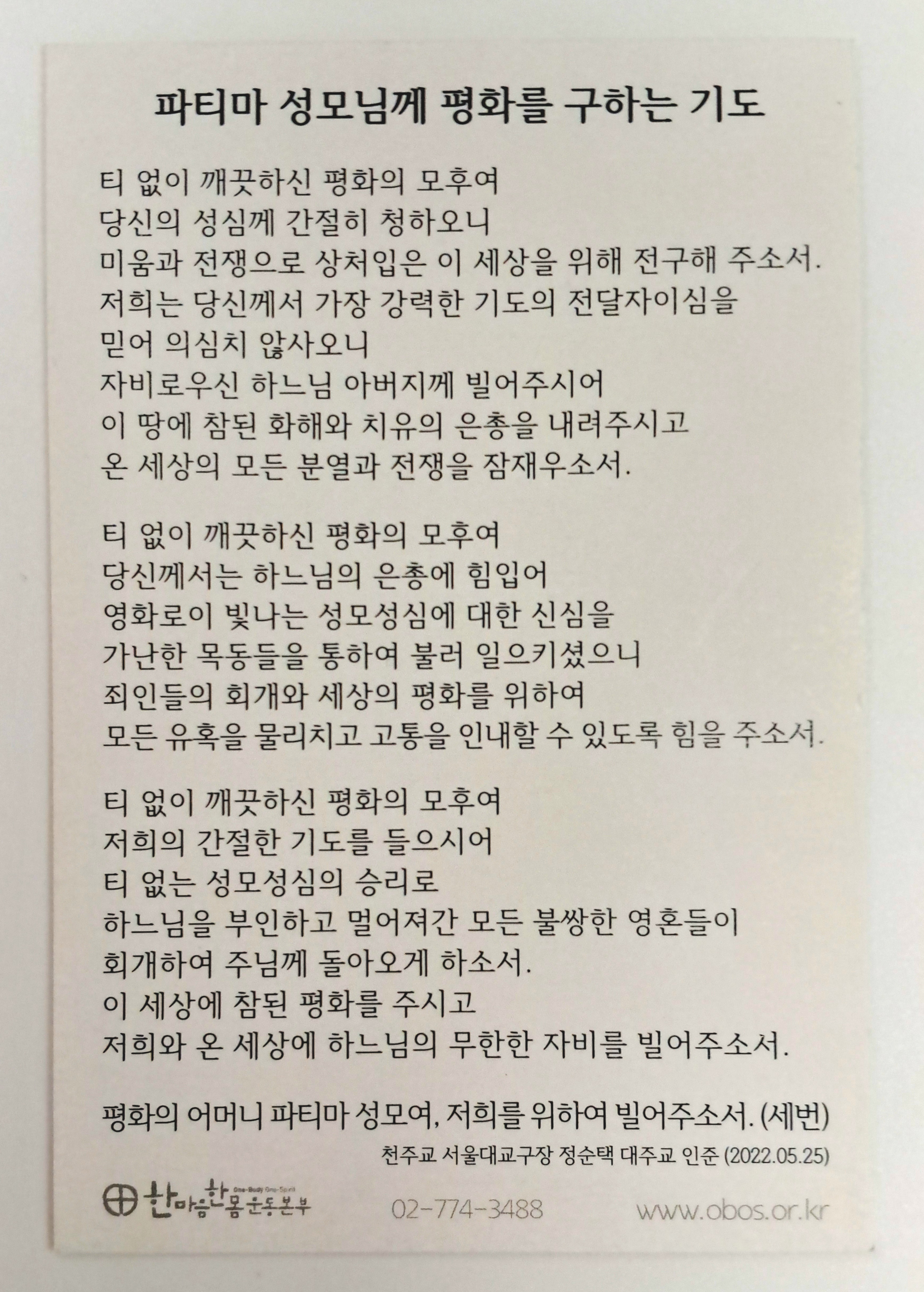 파티마 성모님께 평화를 구하는 기도