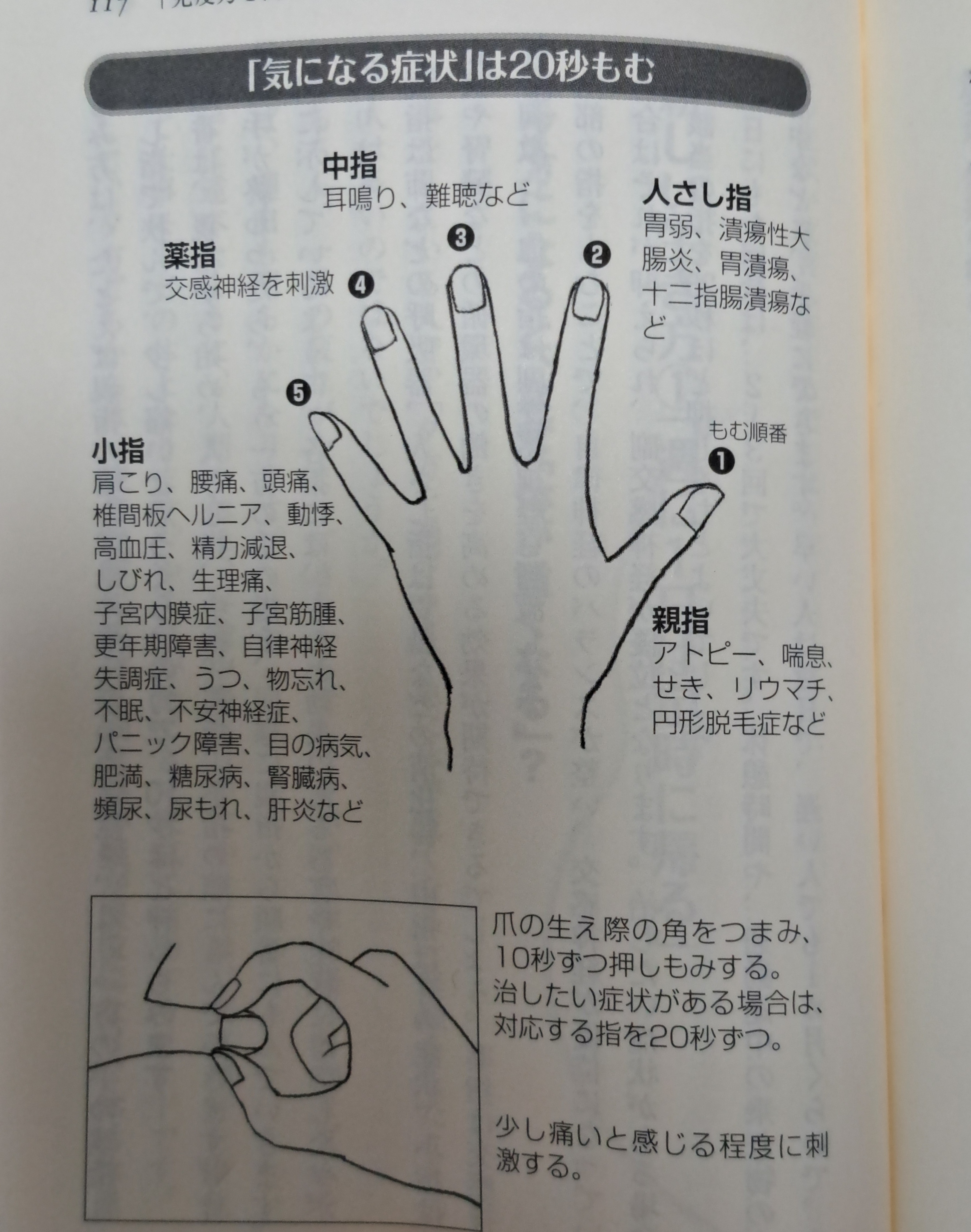 | 새끼손가락 🖐 | 小指 / こゆび | 어깨 결림, 요통, 두통, 추간판(디스크) 탈출증, 부정맥, 고혈압, 정력 감퇴, 손발 저림, 생리통, 자궁내막증, 자궁근종, 갱년기 장애, 자율신경 실조증, 우울증, 건망증, 불면증, 불안 신경증, 공황장애, 안과 질환, 비만, 당뇨병, 신장 질환, 빈뇨, 요실금, 간염 등 |