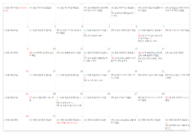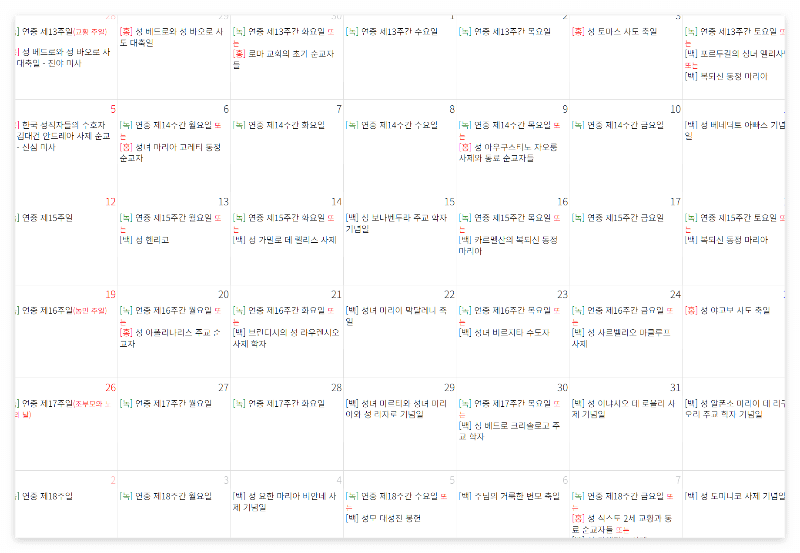 7월은 한국 교회의 큰 스승이신 성 김대건 안드레아 사제를 기억하며 시작합니다. 무더위 속에서도 신앙을 증거했던 순교자들의 뜨거운 열정을 본받는 시기입니다. 연중 시기의 녹색 전례색은 우리 신앙이 일상의 삶 안에서 차분히 뿌리 내리고 자라나야 함을 상징합니다.