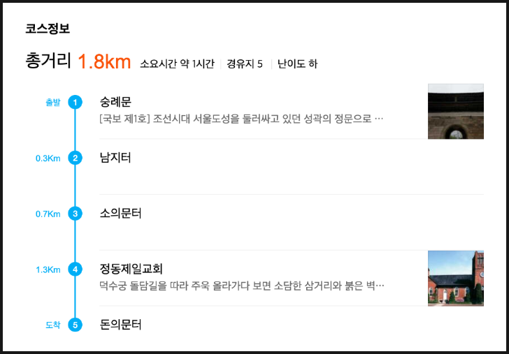 한양도성길 숭례문구간은 1.8km의 거리로 도보로 소요시간은 약 1시간이 걸리는 구간입니다. 난이도 '하'로 걷는 것이 부담스러운 분들께도 도전해 볼만 한 구간 같아요.